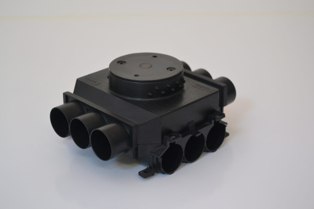 MINTEL produce una cassetta brevettata da incasso a pavimento che, una volta agganciata ad altre, consente la distribuzione di 2 o 3 vie cavi di alimentazione dorsali, in tubi ø25 per i singoli sistemi senza promiscuità, con la possibilità di interconnessioni trasversali.
